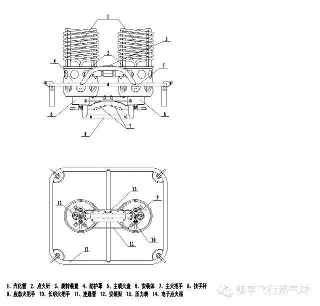 主火焰系统:燃烧器主要功能单元,日常飞行中均使用该系统为球囊持续提供热量。由汽化管、喷火盘、控制阀及管路组成。燃料从燃料瓶经液相管路输送至控制阀,打开阀门,液态燃料经汽化管膨胀汽化,在喷火盘喷嘴处与空气混合,经长明火引燃并喷射出去,形成长度约2.5米的火舌;